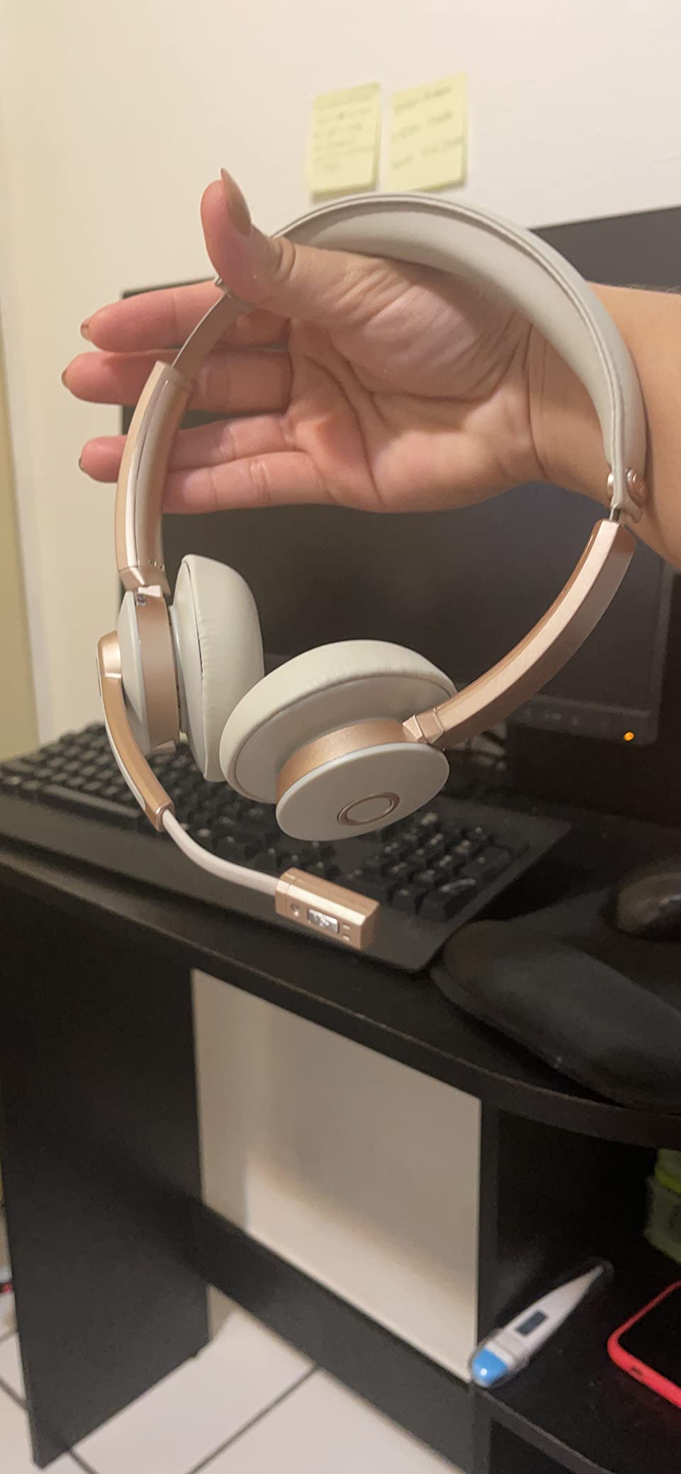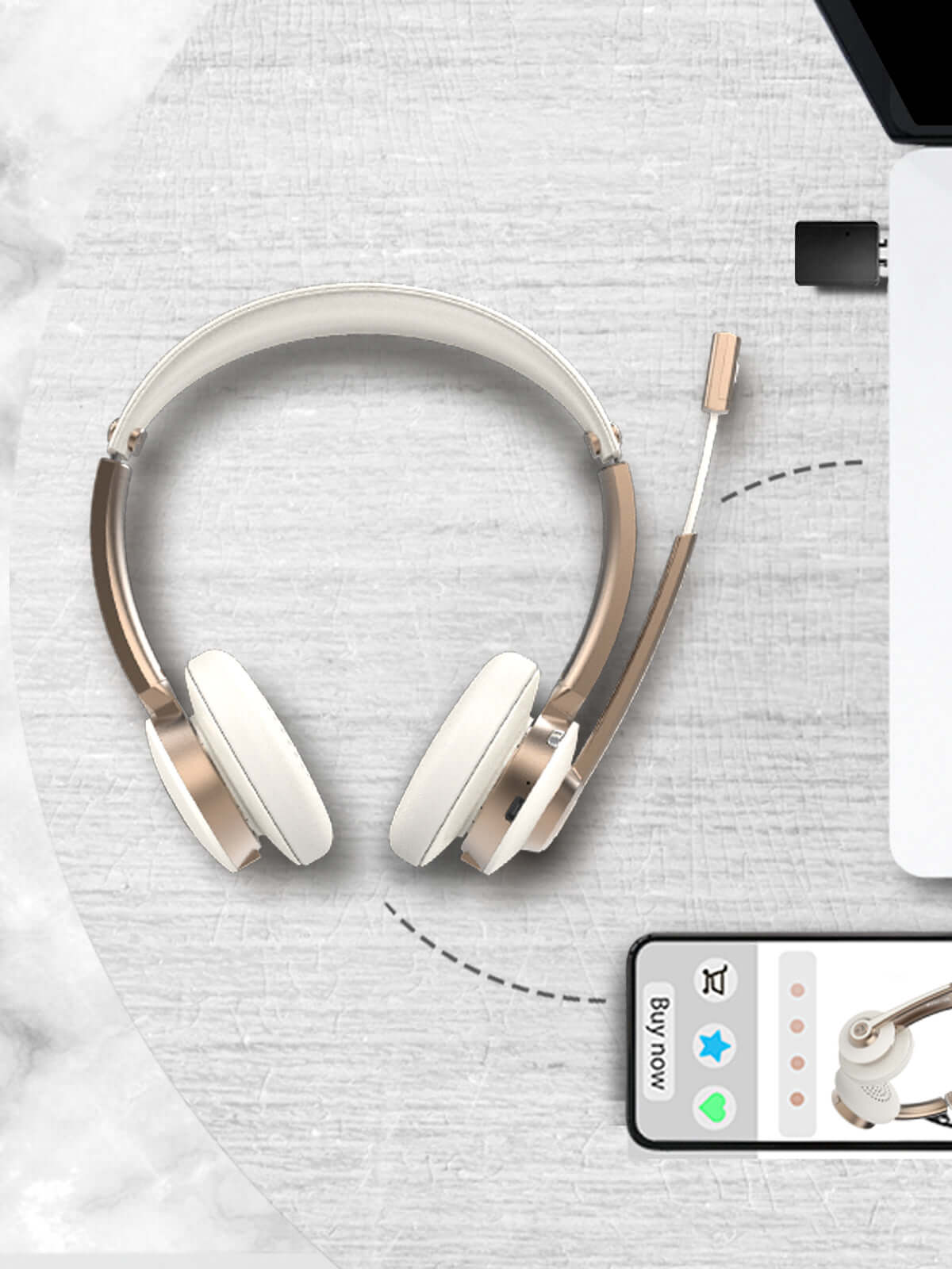 The office headset uses deep-learning technology to detect and eliminate 99.6% of background noise.