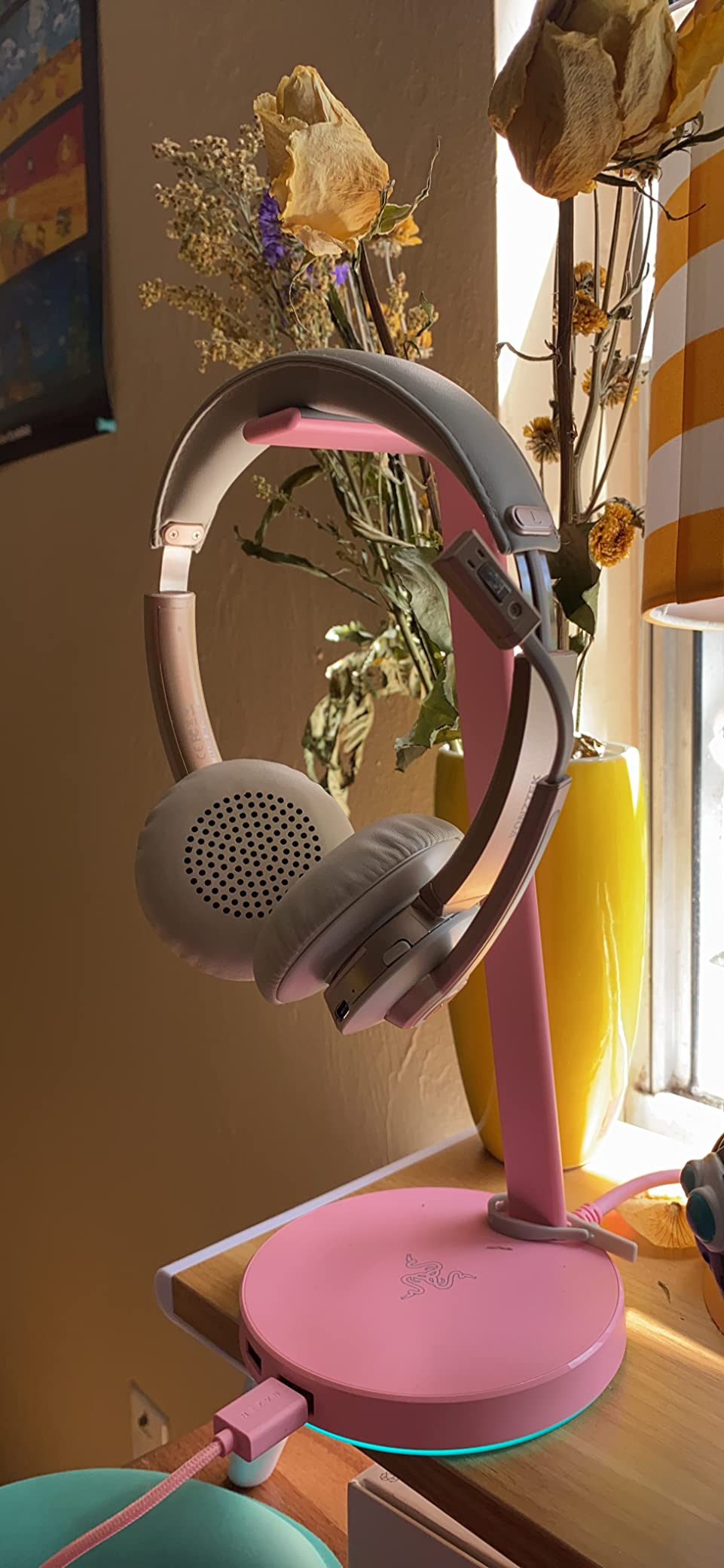The headset with microphone can pair with 2 devices simultaneously, switching freely between them.