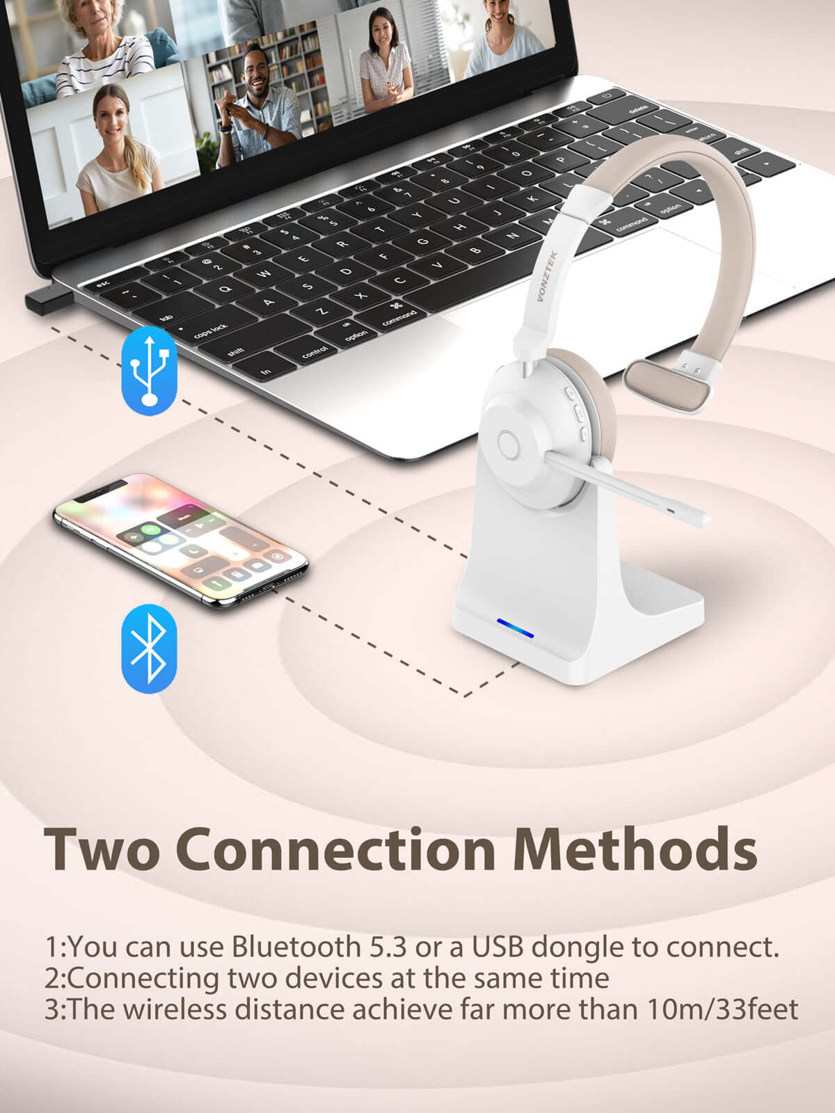 Connect the wireless headsets for work to 2 devices at the same time and easily switch between them.