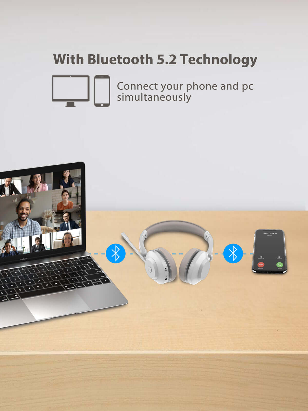 For ultimate productivity, Vonztek wireless headphones BT882DG supports connecting with 2 devices at the same time, No audio delay issues so that you can enjoy an immersive hearing and calling experience.