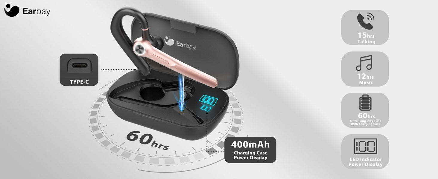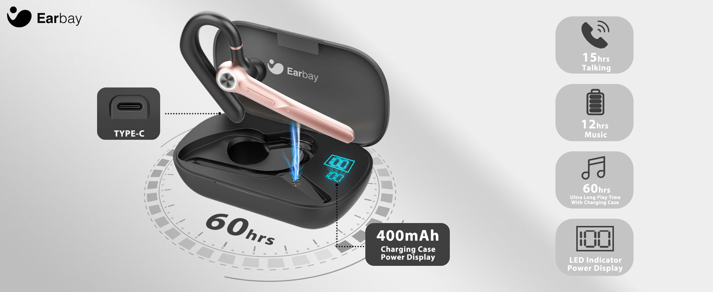 - ă60Hrs Playtime with LED Charging Caseă The LED display on the bluetooth earpiece shows you at a glance when the battery is low. 400mAh charging case provides 4 charges for the wireless headset for work, so you can easily carry and charge earpieces whenever you want. A single 1.5 hour charge allows for 12 hours of playback and talk time, and 500 hours of standby time.