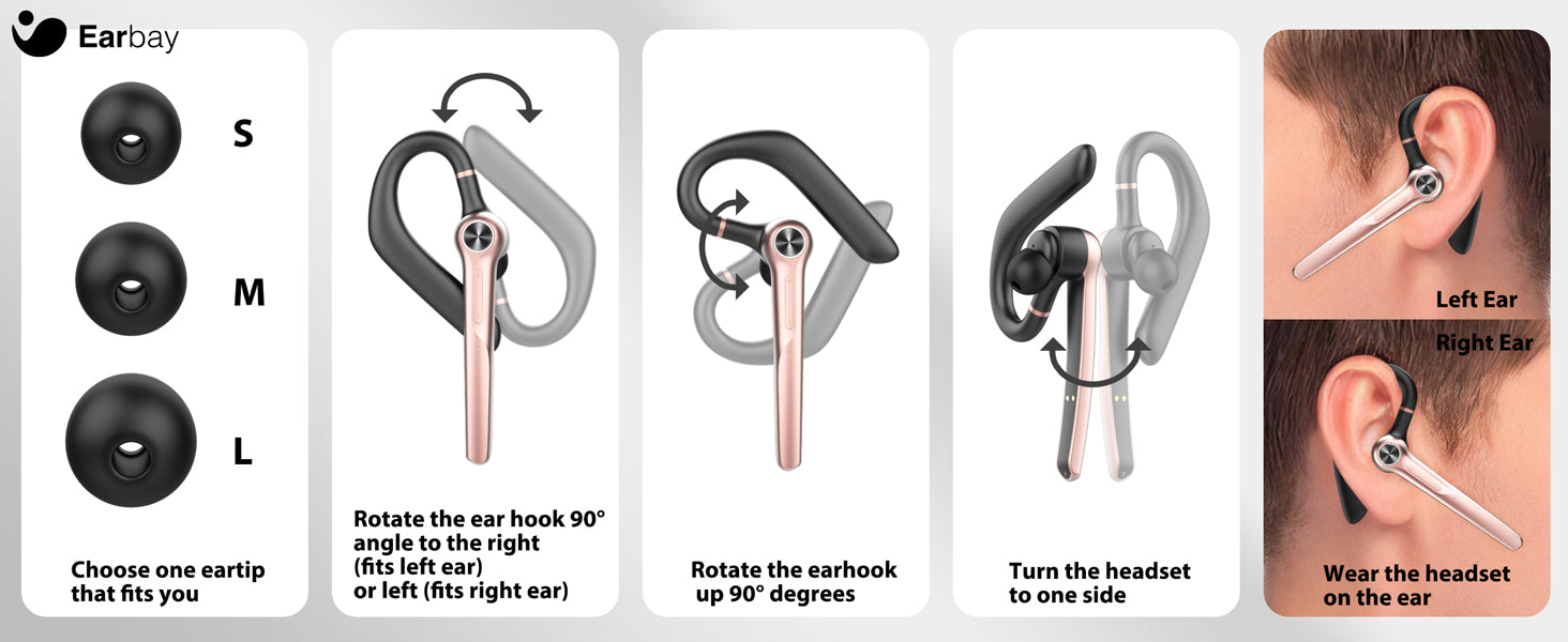 Choose one eartip that fits you,Rotate the ear hook90 angle to the right,Rotate the earhook up 90 degrees,Turn the headset to one side,Wear the headset on the ear